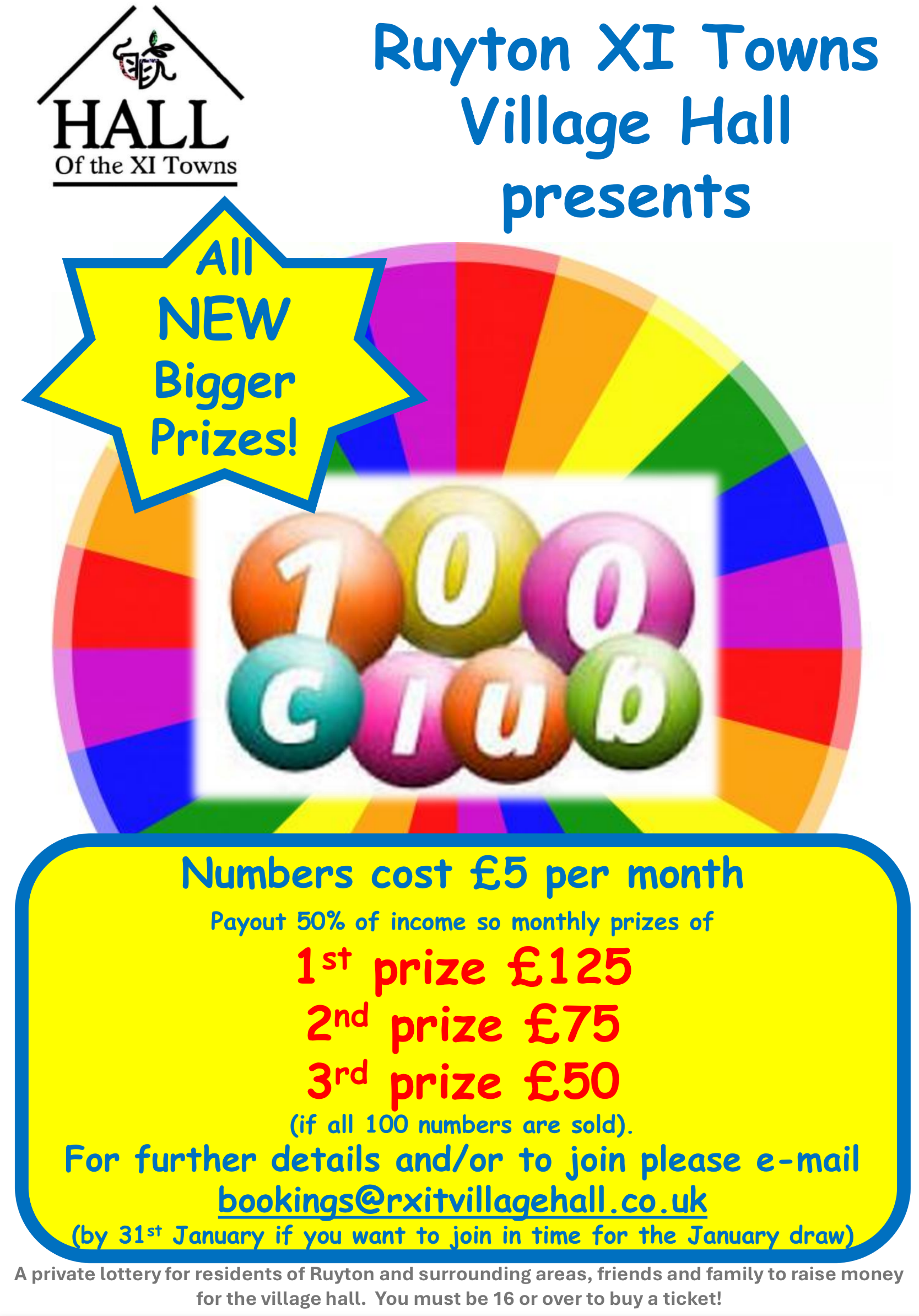 to join our 100 Club for your chance to win a share of £250 each month whilst supporting the Village Hall.
