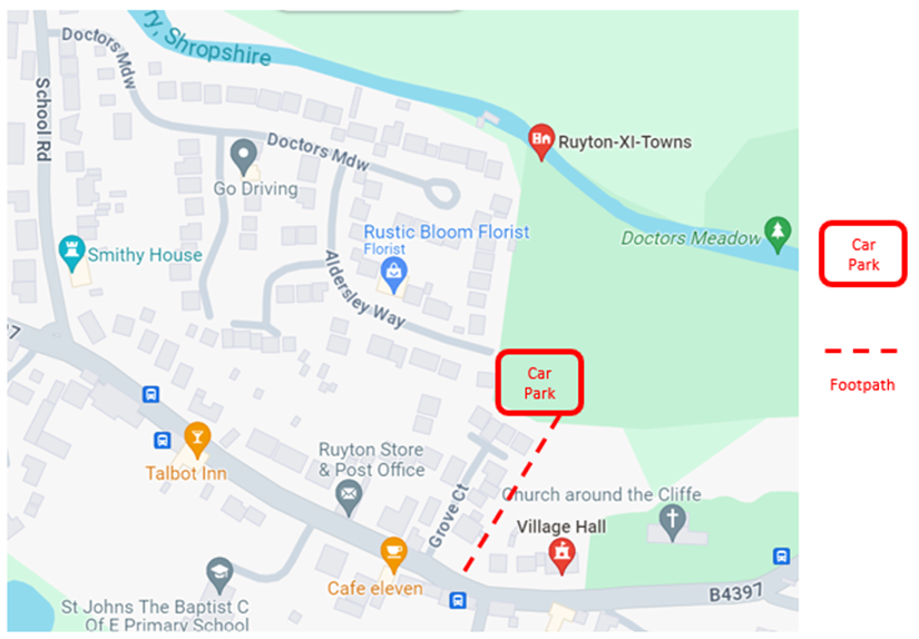 The village hall does not have its own car park but there is parking on the road outside, taking care not to block driveways or entrances or cause an obstruction. There is also an off road car park for approximately 20 cars a short distance away in the Drs Meadow estate and you can walk up a path a short distance to reach the hall without crossing a road. Location shown on the map below.