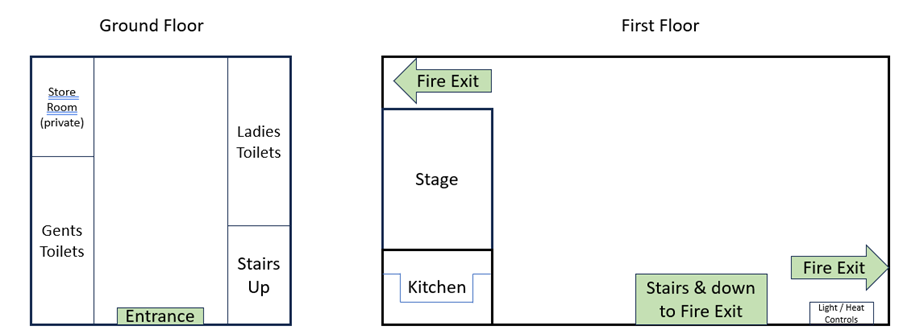 What’s the layout of the Hall? We have an entrance hall giving access to the Main Hall up a flight of stairs, from the entrance hall are lavatories for ladies and gentlemen. A diagram of the hall layout can be found below.